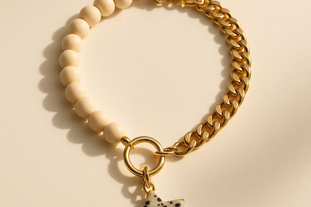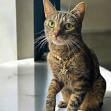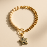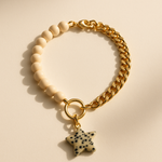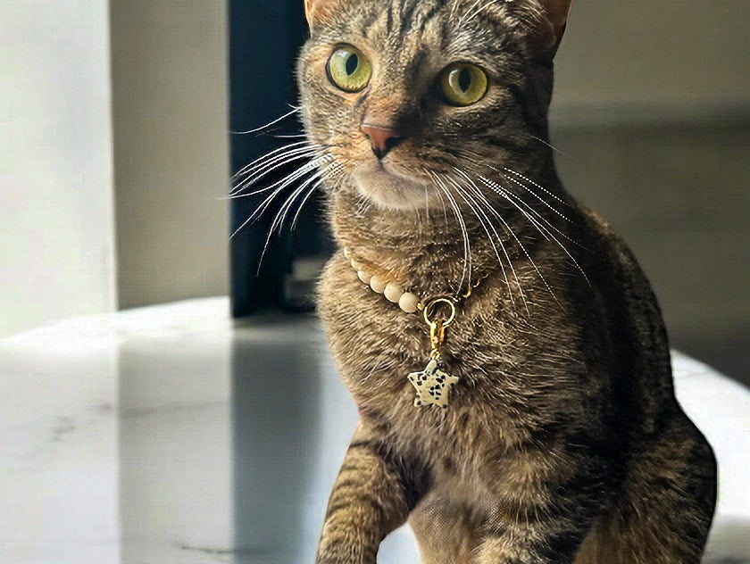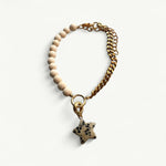 The Solstice Star Collar features wooden cream beads paired with a refined gold chain and accented by a Dalmatian jasper star charm. This piece symbolizes grounding and joy, perfectly blending natural softness with a subtle glow. Crafted for pets who shine with gentle confidence, it offers an elegant touch that highlights their unique spirit.