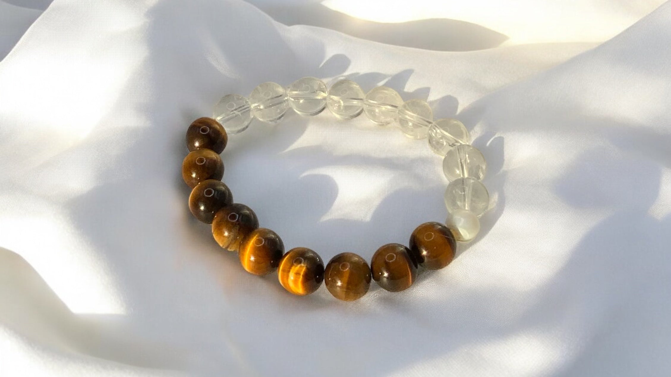 - Material: A blend of Tiger’s Eye and clear quartz beads.