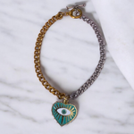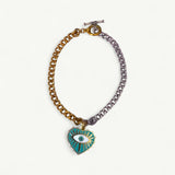 This exquisite pet necklace features a mixed metal chain accented by a turquoise enamel heart charm with a luminous eye motif. Symbolizing balance and protection, its two-tone design blends warm and cool tones for a harmonious look. Handcrafted for durability and comfort, this statement piece brings celestial elegance and thoughtful symbolism to any occasion.